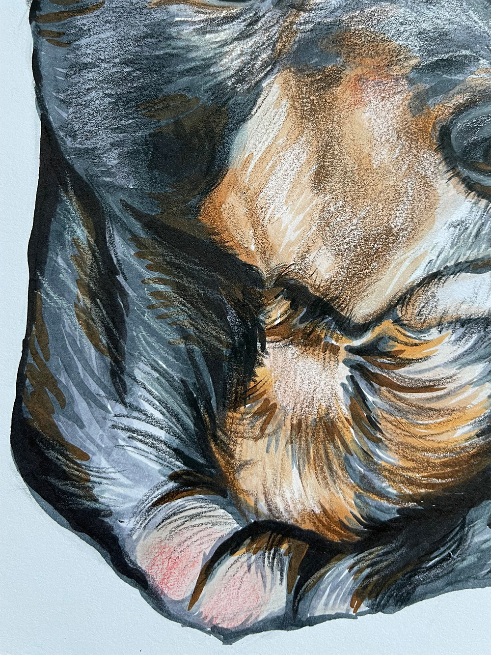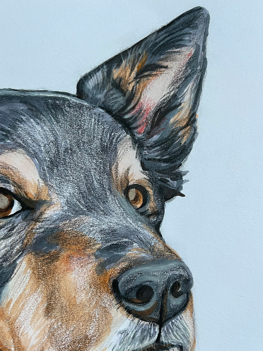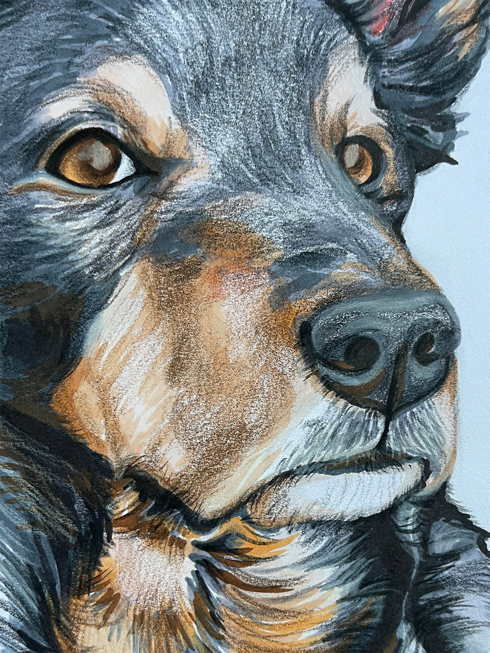 This commissioned portrait was created from a low-quality, close-up reference image, which meant I had to interpret and reconstruct several details using my own visual judgement. My main goal was to achieve a realistic likeness of the dog, while making only minor artistic adjustments to enhance the final result. The overall style remains grounded in realism, with slightly exaggerated colour to add vibrancy and depth, and intentionally imperfect marker-style brush strokes and soft pencil textures to give the piece a more natural, hand-drawn feel. Rather than replicating the photograph exactly, I aimed to preserve realism while allowing small stylistic choices to add warmth and personality.