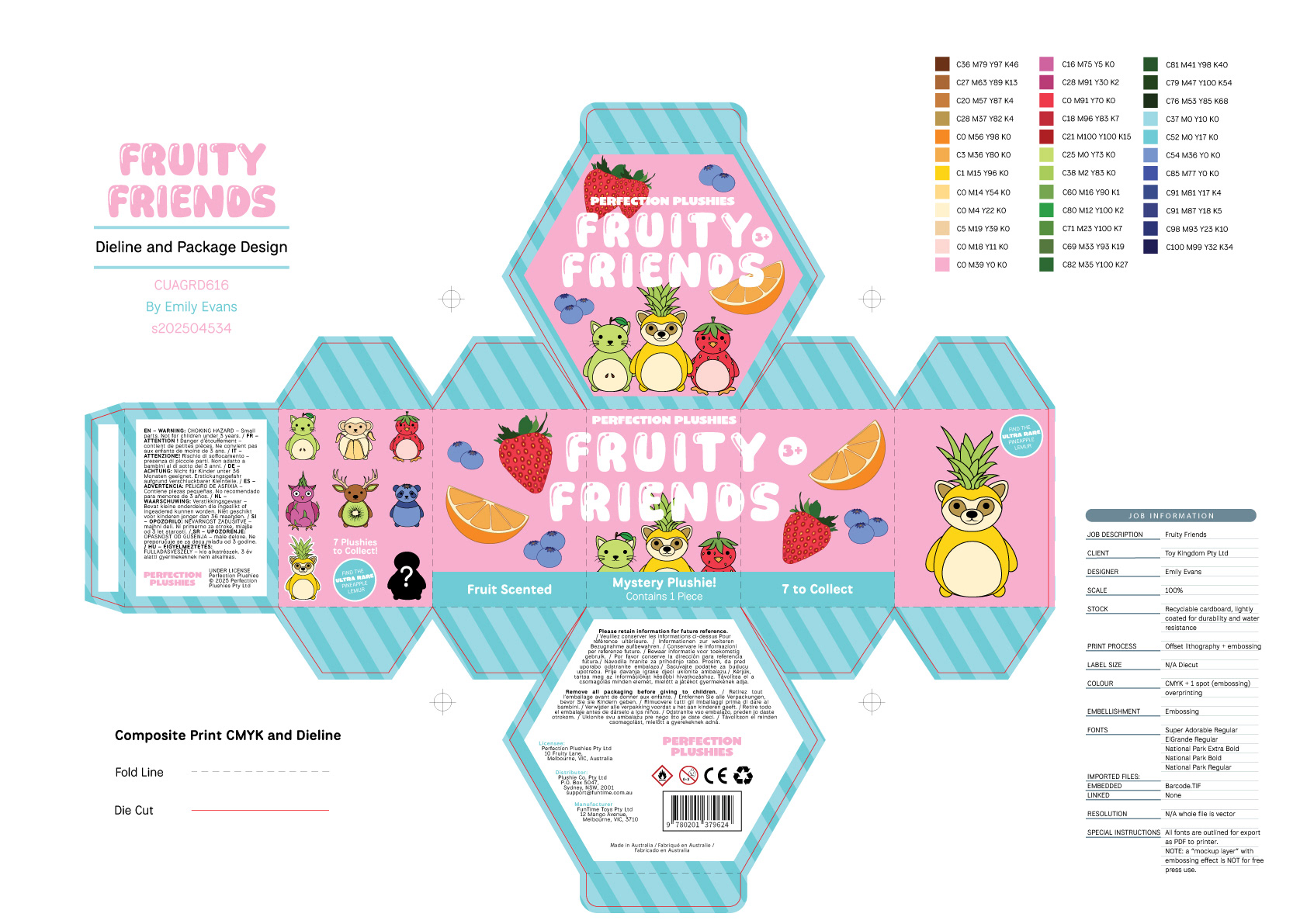 “Fruity Friends” (2025) is a conceptual packaging design created for an open brief. I have designed each plush toy is a fruit-themed animal, with seven to collect: Pear Cat, Banana Monkey, Strawberry Penguin, Dragonfruit Owl, Kiwi Moose, Blueberry Panda, and the ultra-rare Pineapple Lemur. I aimed to create a fun, playful, and imaginative design targeted toward pre-teen girls. My goal was to design packaging that kids (and even adults!) would be excited to discover in stores; something bursting with life, colour, and personality.