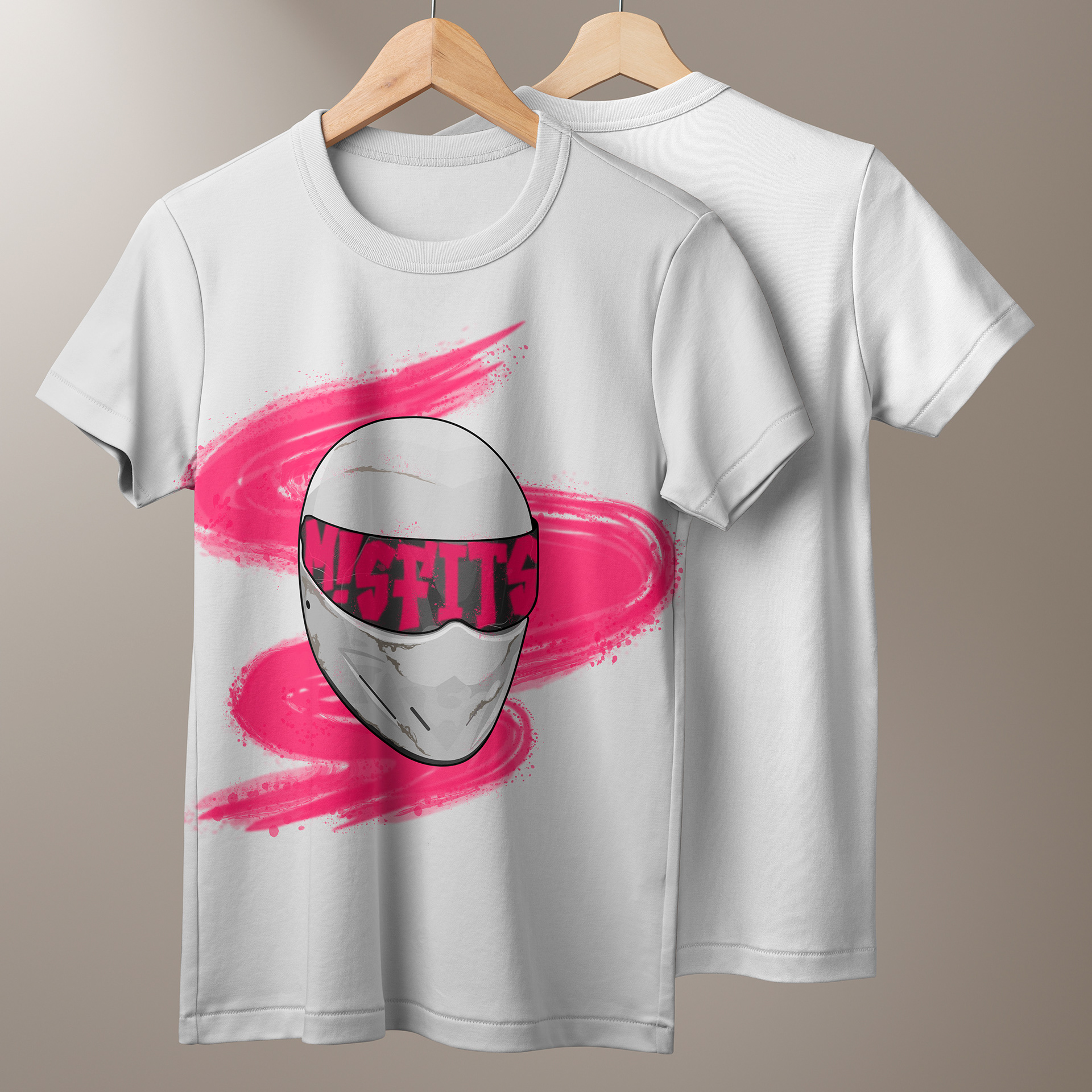 This logo was created for "M!sfits", a street racing crew within the GTA V (FiveM) community. The client requested a design featuring a worn Stig-style helmet with the crew’s name spray-painted across the visor. I developed a stylised illustration of the helmet, focusing on capturing a gritty, rebellious aesthetic that reflects the underground racing culture. The typography was adapted from a free typeface, which I distorted to fit the visor’s perspective and enhance the sense of energy and motion. A spray-painted texture was incorporated into the background to complete the street-inspired look. The logo was later applied to various in-game clothing items, including hoodies, shirts, socks, and a custom helmet design.