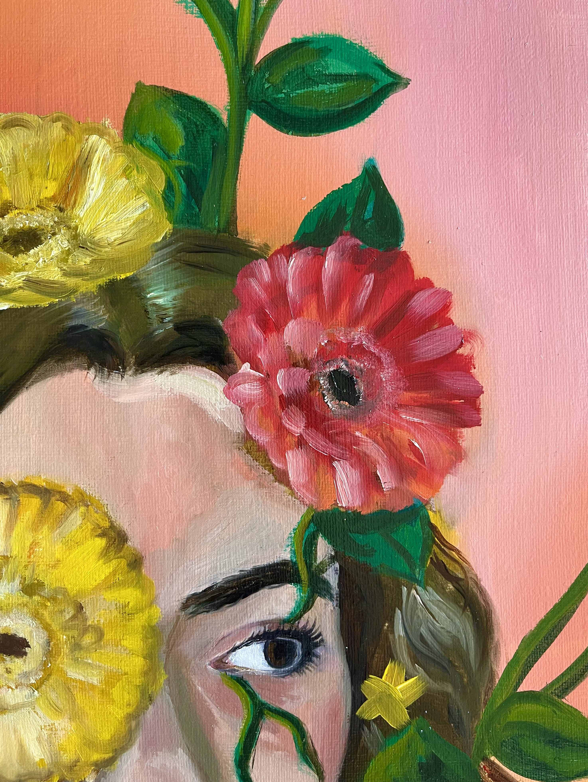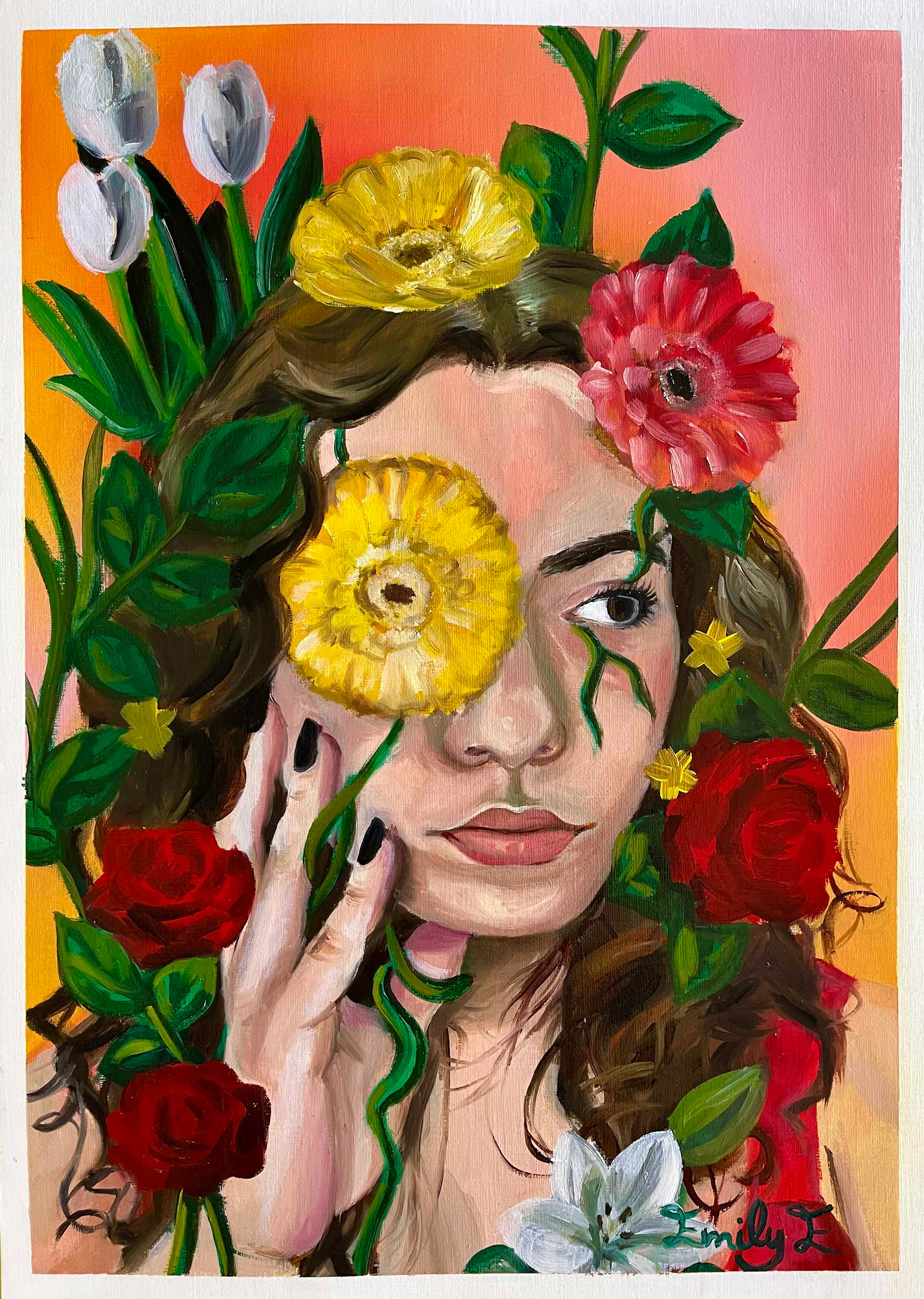 “Overgrown” is a self portrait covered in vines and flowers. It is meant to represent my love for nature, and how connected I am to it. I have used warm colours to represent this fulfilled and passionate feeling. It is an oil painting on paper.