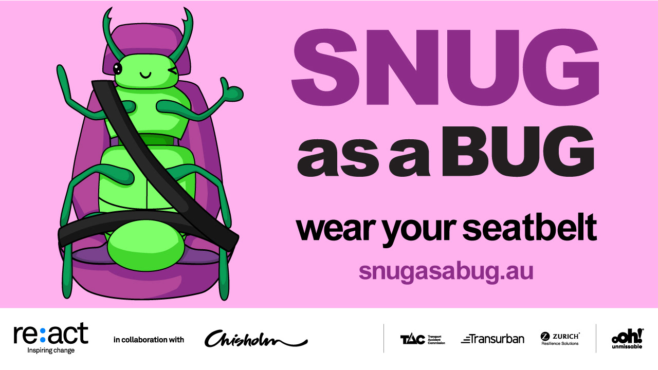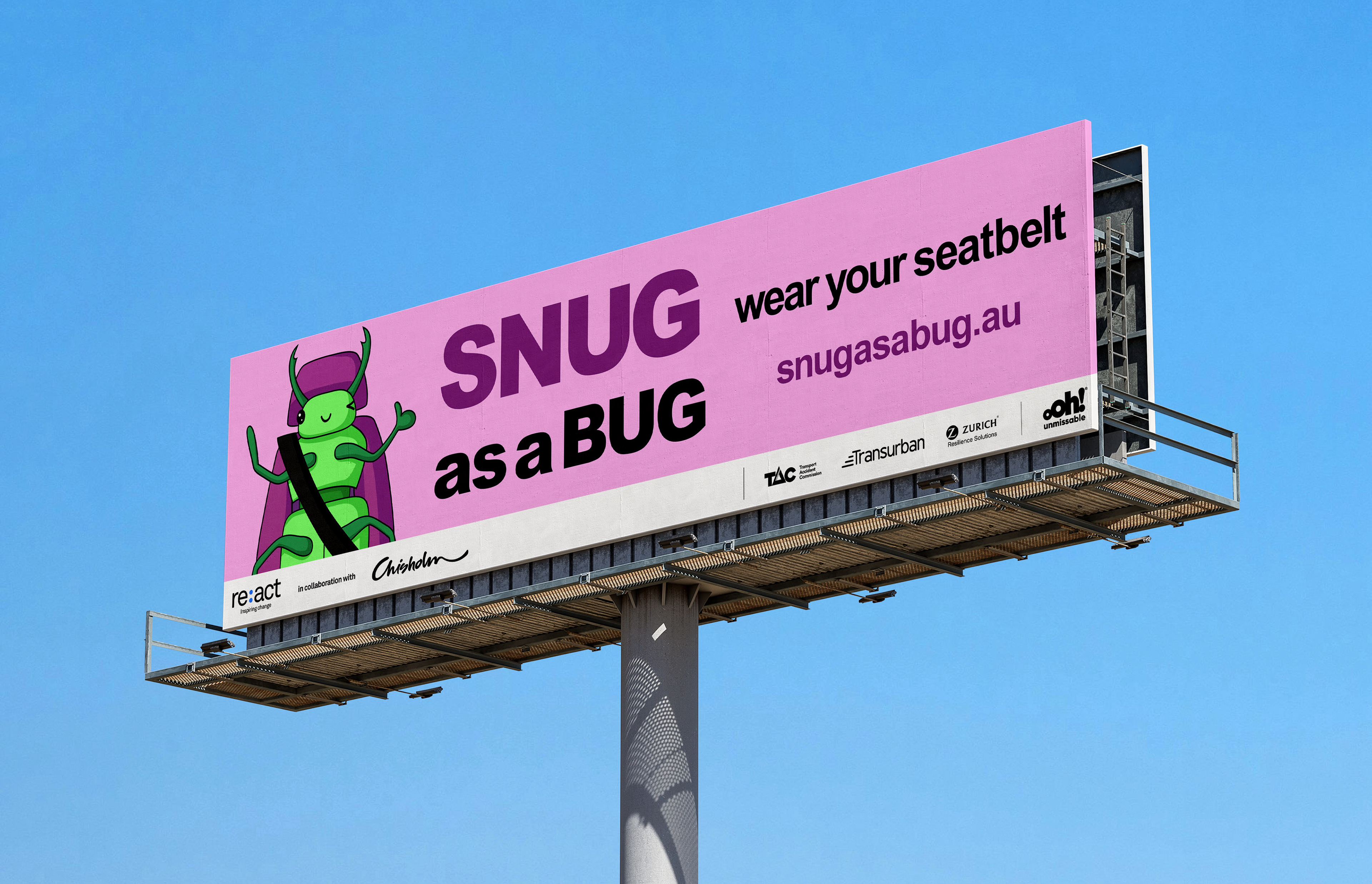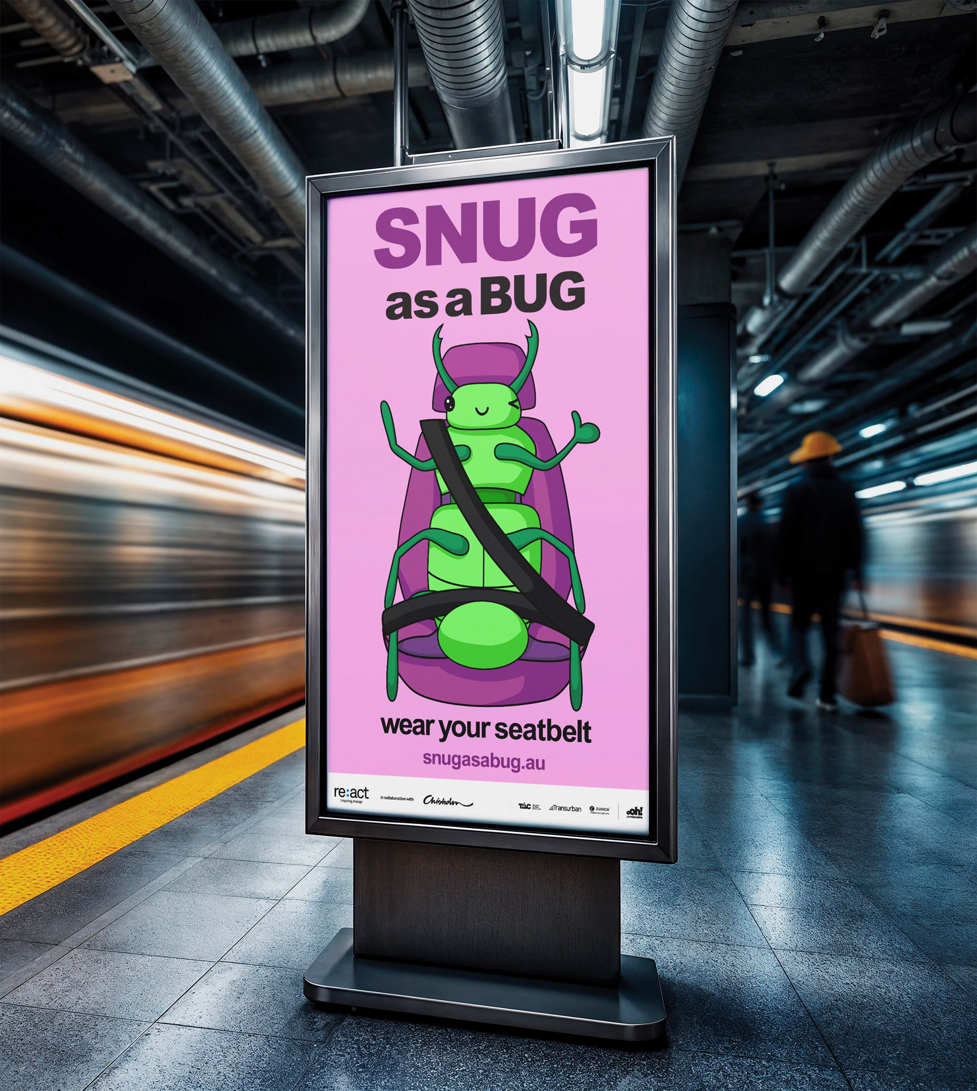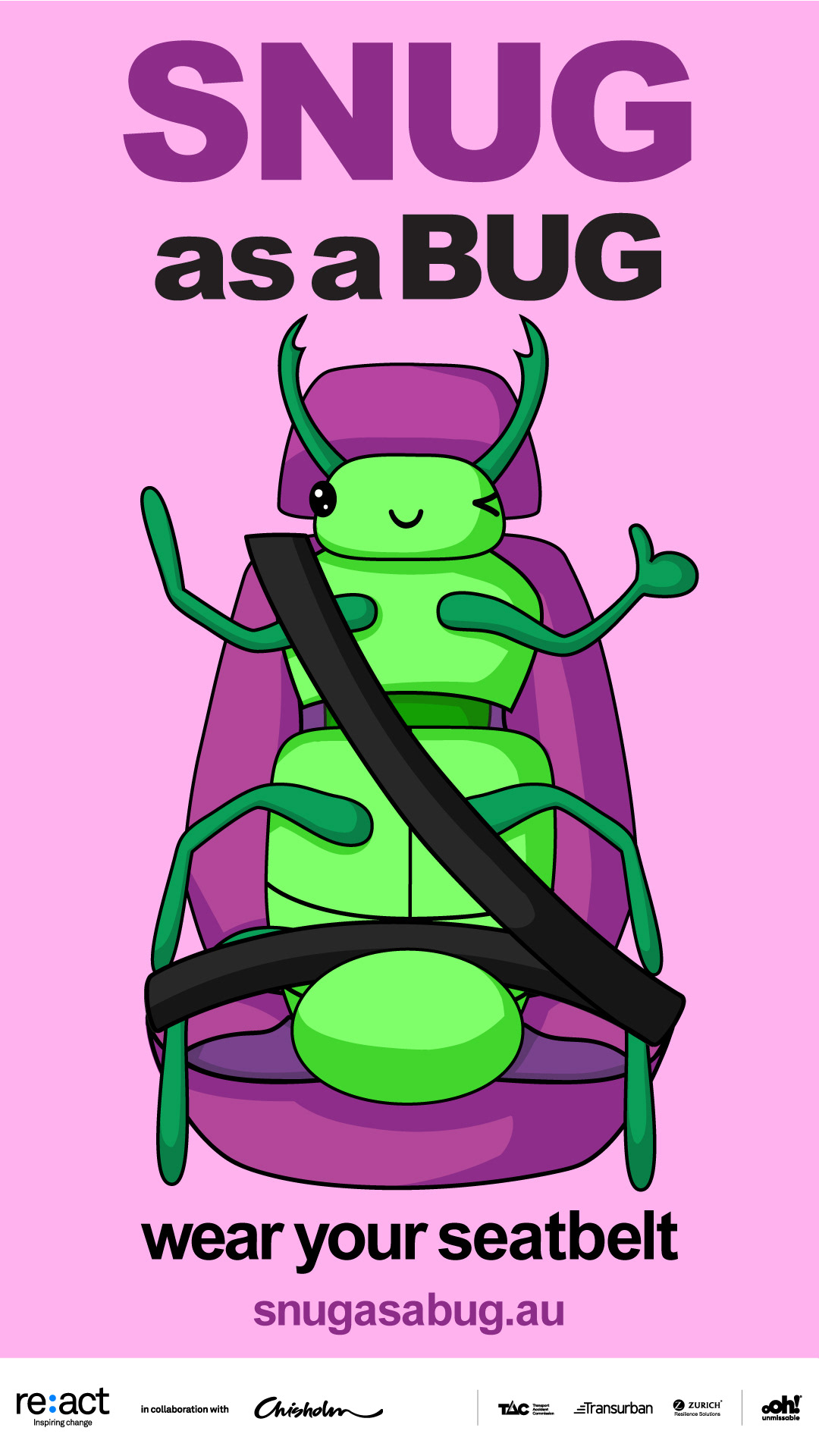 “Snug as a Bug” (2025) was created for the RE:ACT program, which promotes seatbelt safety among 17–25-year-olds. RE:ACT runs annual campaigns to raise road safety awareness, particularly targeting young people. For this project, the company wanted a unique billboard design that conveyed a positive message, reflecting their distinctive approach to promoting safety. Although my design wasn’t selected to be placed on billboards across Melbourne, it was chosen as one of the top three. I reimagined a well-known idiom with a playful twist to engage young audiences and encourage safe driving habits. I wanted to include an illustration in my design to give it personality and reflect my style, and this idiom provided the perfect opportunity. I created a cute bug character, shown wearing their seatbelt correctly. I used simple shading and bright colours to ensure contrast and legibility. I also focused heavily on typography, experimenting with point sizes and font families to achieve a bold design that would be easy to read from the freeway, while keeping the message clear and impactful.