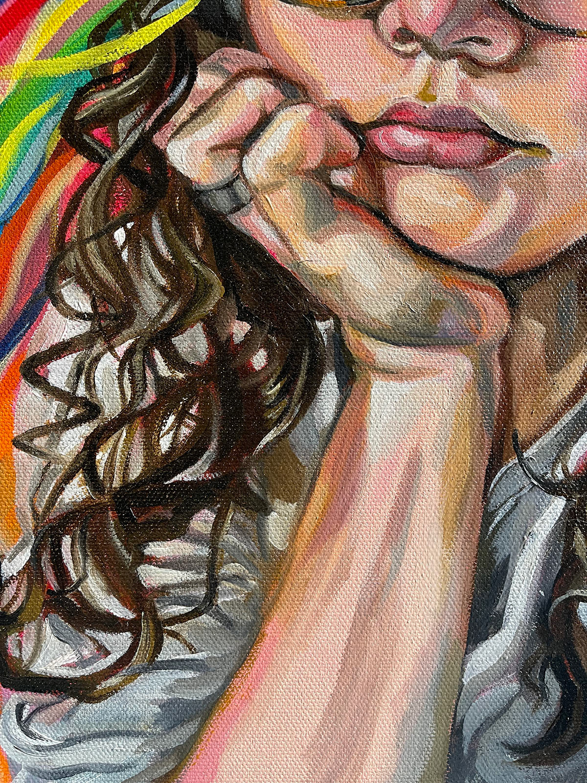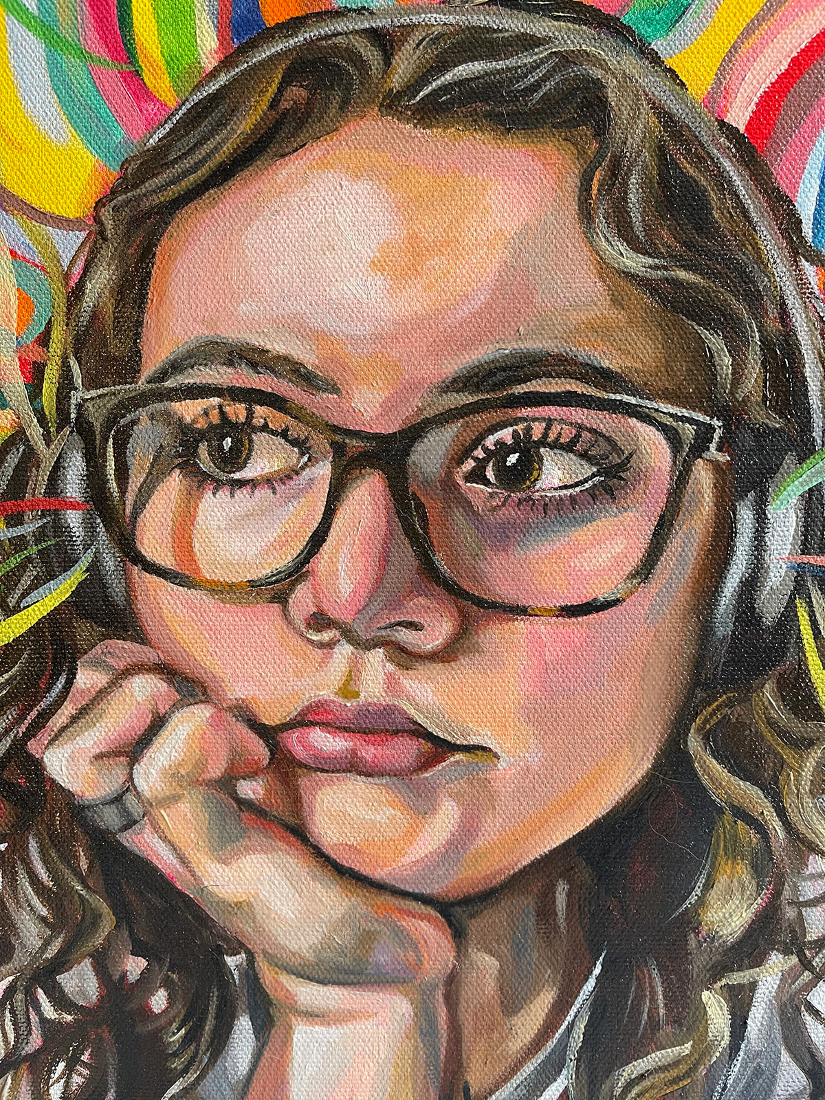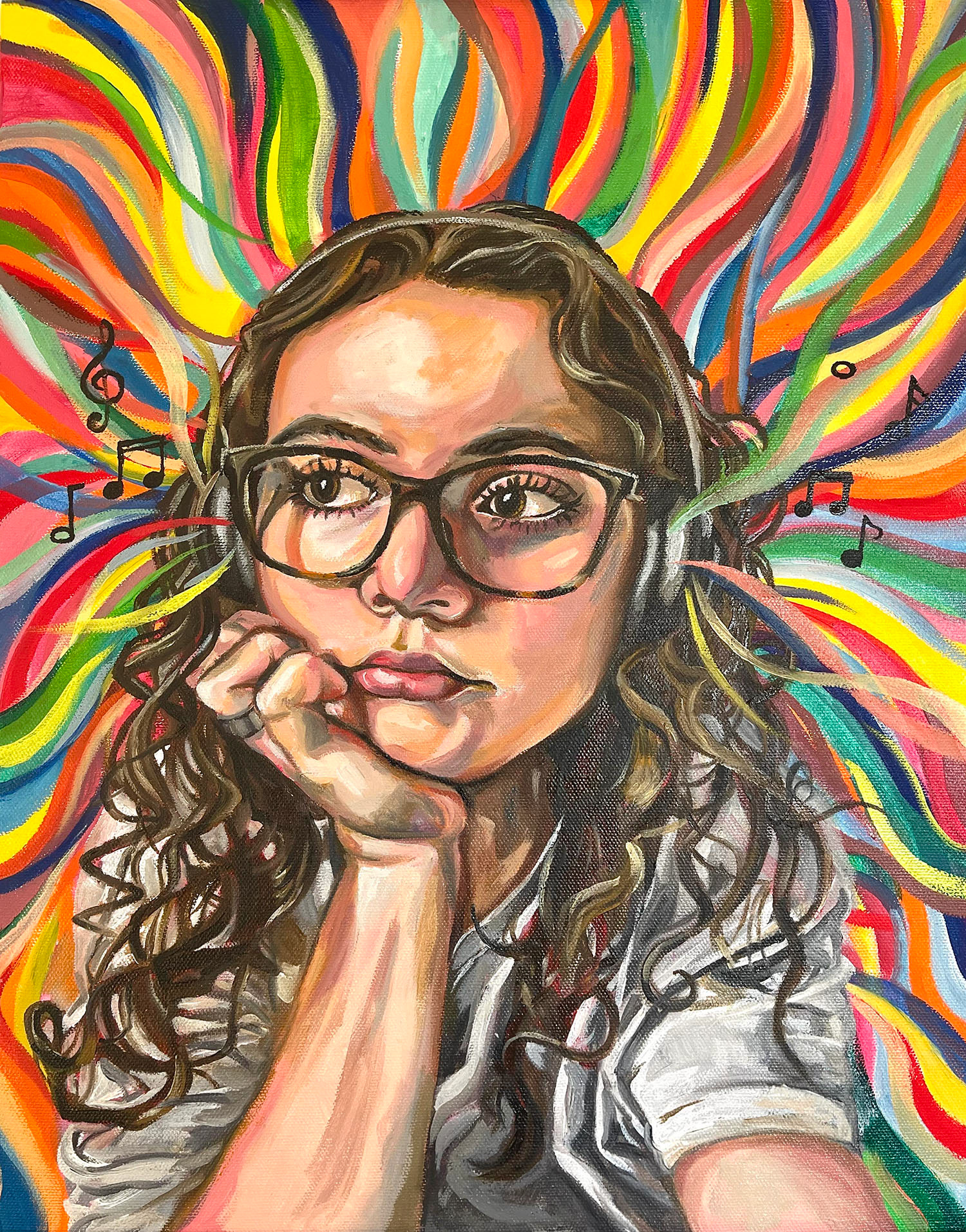 “The Art of Music” is a self portrait oil painting that explores the emotions music evokes through colour and movement. The swirling lines emerging from the headphones capture the invisible energy of music; its rhythm, flow, and the emotions it creates.